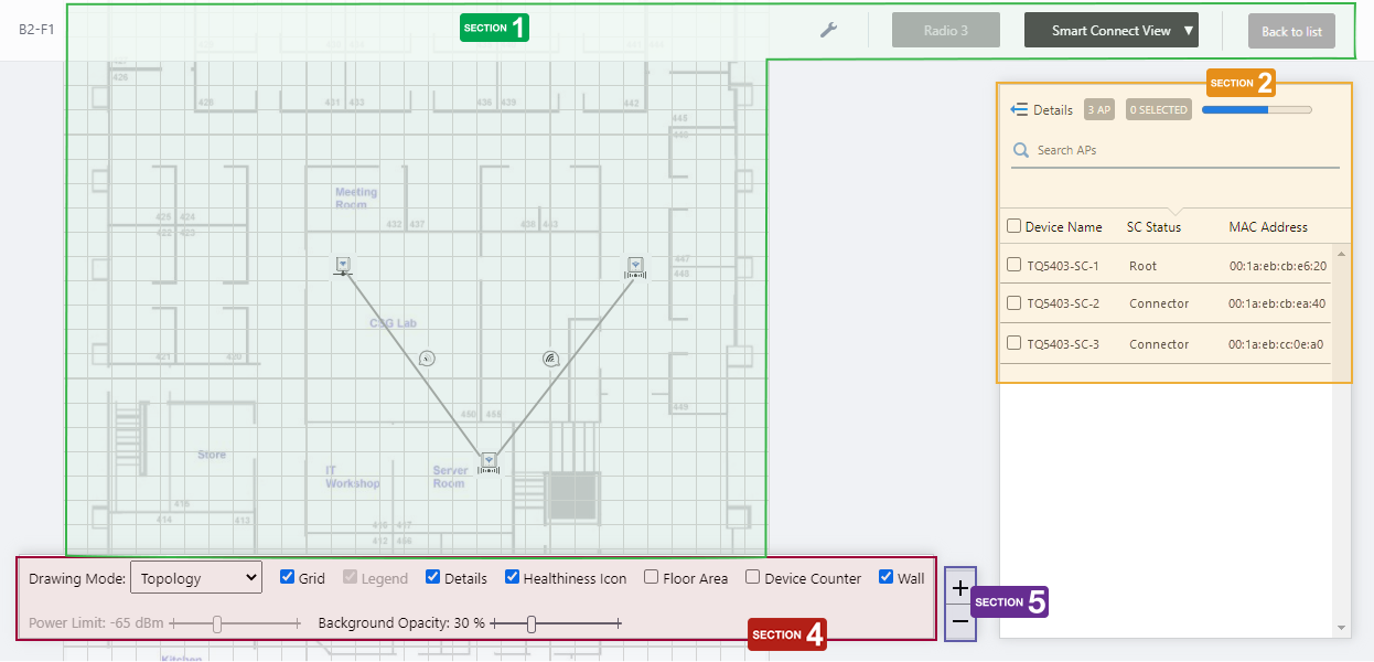| Drawing Mode | The options in the Drawing Mode dropdown menu differ according to the immediately previous selection of the Views. If you chose Smart Connect View previously, the Drawing Mode dropdown comes with Topology and Traffic, and if you chose another view, the dropdown comes with Power and Channel. |