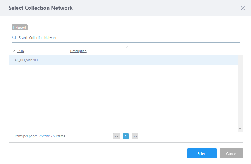 Select the Network (VAP) to be used for MAC address collection. By clicking the field, Select Collection Network dialog box will be displayed. "Select Collection Network" dialog box lists the Network SSID configured on the Profile selected above. This MAC Address Collection Network needs to be created separately from the Network used for normal communication. The following conditions apply to the Networks that can be listed in the "Select Collection Network" dialog box.