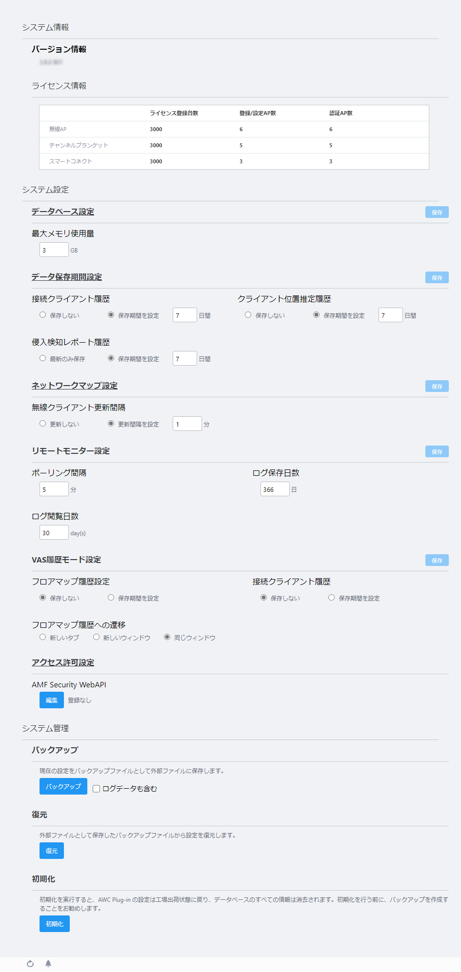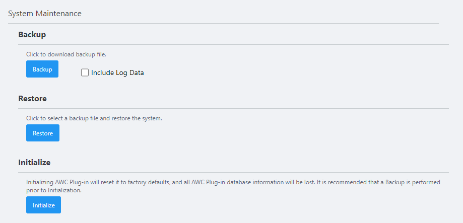The System Setting page lets you see the AWC Plug-in version, factory-reset the plug-in, and configure system settings.