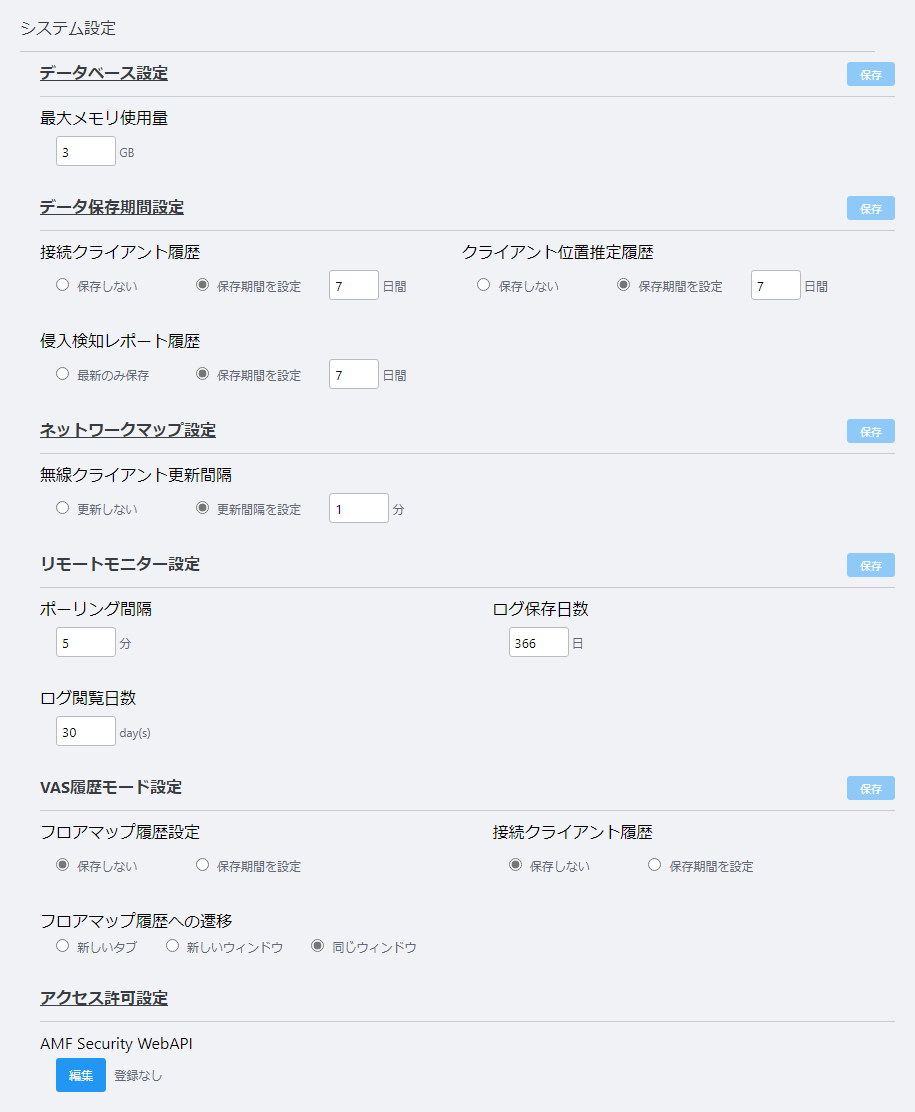 NoteWhen you change this setting, the associated client history is initialized. NoteThe Data Retention Period Setting can be set up to 31 days on the screen, but the operation with the period up to 14 days is supported. NoteWhen you use Associated Client History with the following wireless APs, please set the log severity of the wireless AP to "information(6)" or higher. If the log severity is set to "debug(7)", this feature is not supported. |