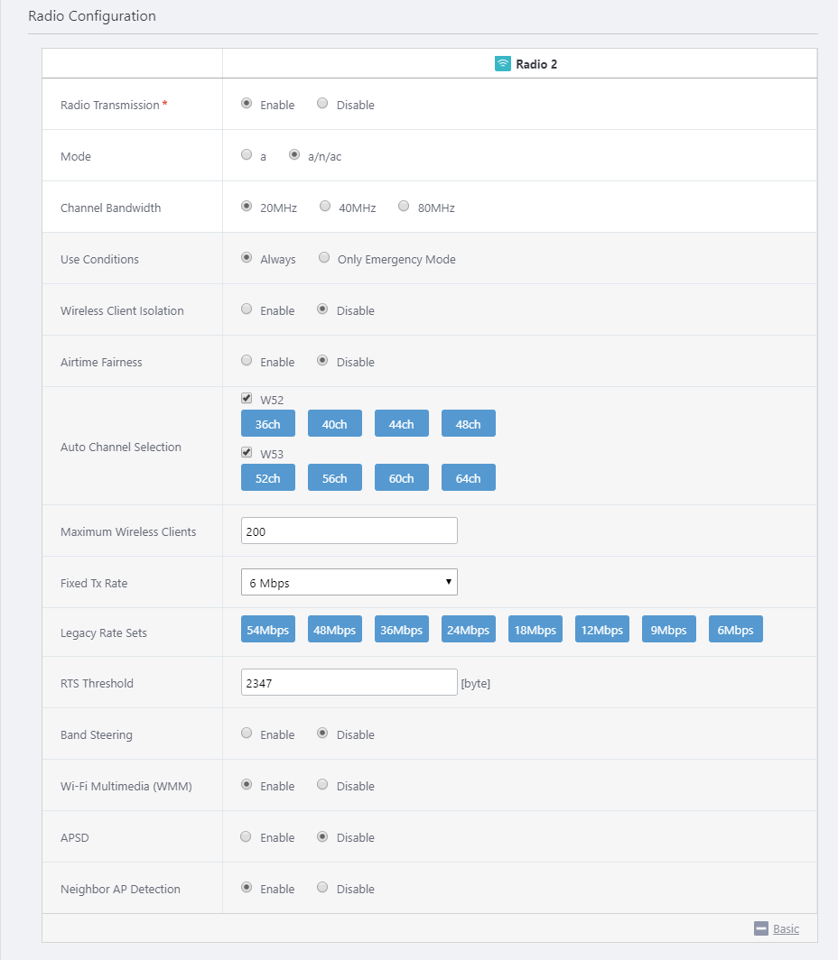 Refer to Enable Emergency Mode for more details.Wireless Client Isolation Disable Disable Specify whether to block communication between wireless clients connected to the same VAP. Airtime Fairness Disable Disable Specify whether to give each client an equal amount of airtime regardless of its speed. Auto Channel Selection All All Specify the channels to use. All channels are selected by default. Maximum Wireless Clients 200 200 Specify the maximum number of clients that can connect to the APs. Fixed Tx Rate 11 Mbps 6 Mbps Specify the fixed Transmission Rate for IEEE 802.3 Multicast/Broadcast. Legacy Rate Sets All rates except 1/2Mbps All Specify valid rates to use when IEEE 802.11b/g or IEEE 802.11a is being used. RTS Threshold 2347 (Disable) 2347 (Disable) To transmit RTS packets in IEEE 802.11b/g/a mode, select Enable and specify the minimum size of Tx packets. Specifying "2347" disables RTS transmission. Band Steering