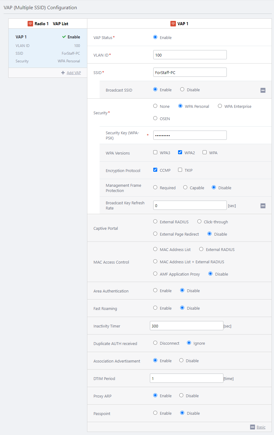SSID ForStaff-PC Specify an SSID (network name) to use on the VAP. Broadcast SSID Enable Specify whether to broadcast the SSID on the VAP. Security WPA Personal Specify a security method for the VAP. Security Key (WPA-PSK) 5+@f/=0N1y Specify an encryption key for the VAP. WPA versions WPA2 Specify a WPA version to use on the VAP. Encryption Protocol CCMP Specify an encryption protocol to use on the VAP. Management Frame Protection Disable Specify whether to protect management frames from eavesdropping and forging. Broadcast Key Refresh Rate 0 Specify an interval at which to refresh the broadcast key that is sent to clients on the VAP. Specifying "0" stops the key from refreshing. Captive Portal Disable Specify whether to use the Captive Portal feature on the VAP. MAC Access Control Disable Specify whether to use MAC Access Control on the VAP. Area Authentication Disable Specify whether to use the Area Authentication function. Fast Roaming Disable Specify whether to use Fast Roaming of wireless clients. Inactivity Timer 300 Specify the delay before disconnecting a client that disappears without notifying the APs. Duplicate AUTH received Ignore Select how to process connection requests from clients that have maintained a connection. Association Advertisement Enable Specify whether to use Association Advertisement. DTIM Period 1 Specify how frequently to insert a DTIM (Delivery Traffic Indication Map) in the AP's beacons (every 1 to 255 beacons). Proxy ARP
