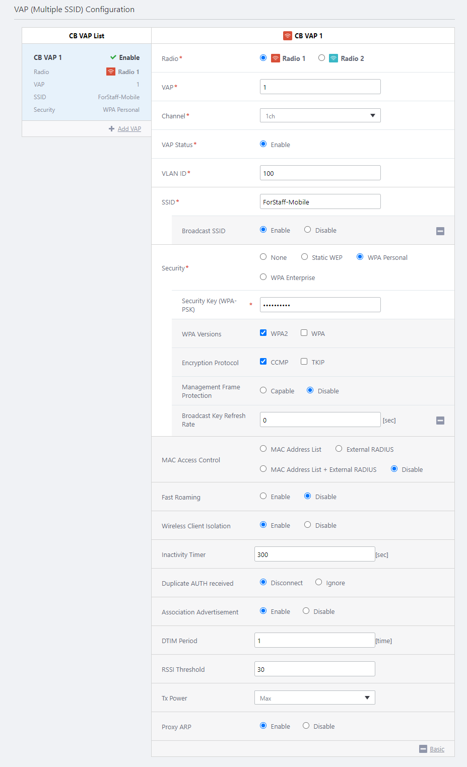 SSID ForStaff-Mobile Specify an SSID (network name) to use on the CB VAP. Broadcast SSID Enable Specify whether to broadcast the SSID on the CB VAP. Security WPA Personal Specify a security method for the VAP. Security Key (WPA-PSK) 5+@f/=0N1y Specify an encryption key for the VAP. WPA versions WPA2 Specify a WPA version to use on the VAP. Encryption Protocol CCMP Specify an encryption protocol to use on the VAP. Management Frame Protection Disable Specify whether to protect management frames from eavesdropping and forging. Broadcast Key Refresh Rate 0 Specify an interval at which to refresh the broadcast key that is sent to clients on the VAP. Specifying "0" stops the key from refreshing. MAC Access Control Disable Specify whether to use MAC Access Control on the VAP. Area Authentication Disable Specify whether to use the Area Authentication function. Fast Roaming Disable Specify whether to use Fast Roaming of wireless clients. Wireless Client Isolation