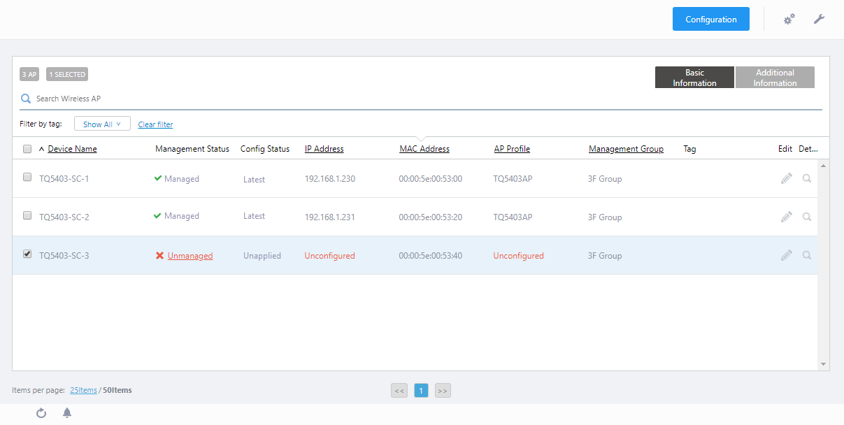 At this time, the MAC address "00: 00: 5e: 00: 53: 40" of "TQ5403-SC-3" is checked agiainst the MAC address list of the candidate AP to be managed.