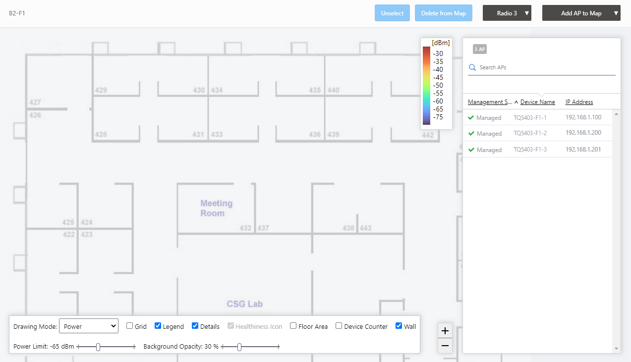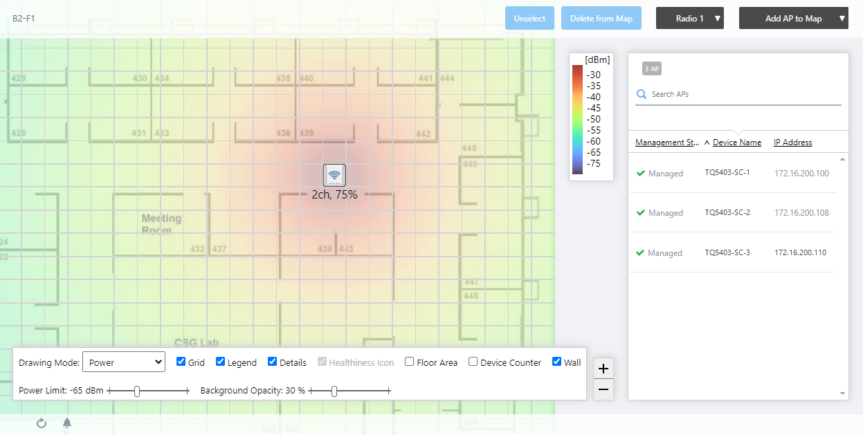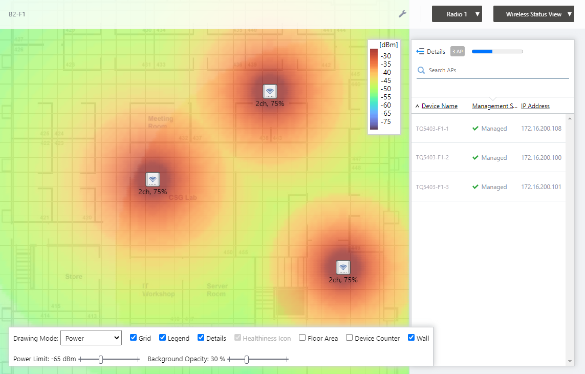 The heatmap calculates the radio signal strength at a given point from an AP's transmit power and the distance between the AP and the point. Because it assumes that there are no obstacles and reflection between the AP and the point, the actual radio signal strength may differ from the heatmap's calculation.