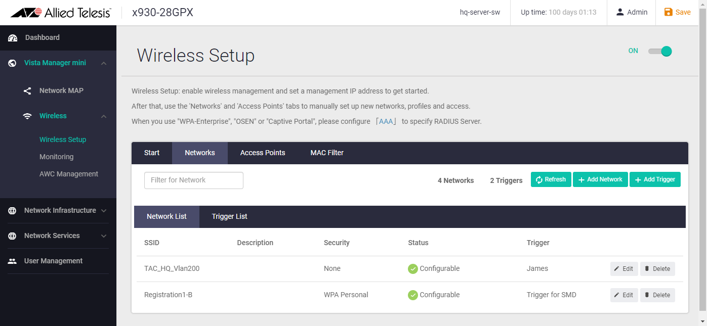 To enable/disable the MAC Address Collection Network from the AWC plug-in, register the Trigger in Vista Manager mini and apply the Trigger when creating the MAC Address Collection Network.