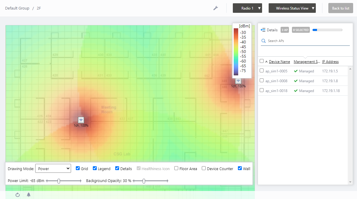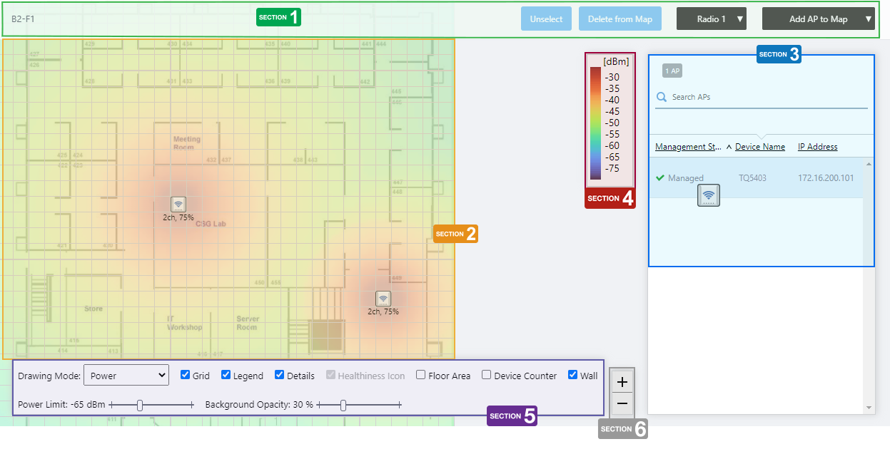NoteEven between wireless APs operating at the same radio strength, the size of output circle on the heat map may vary depending on the installation location and other factors.