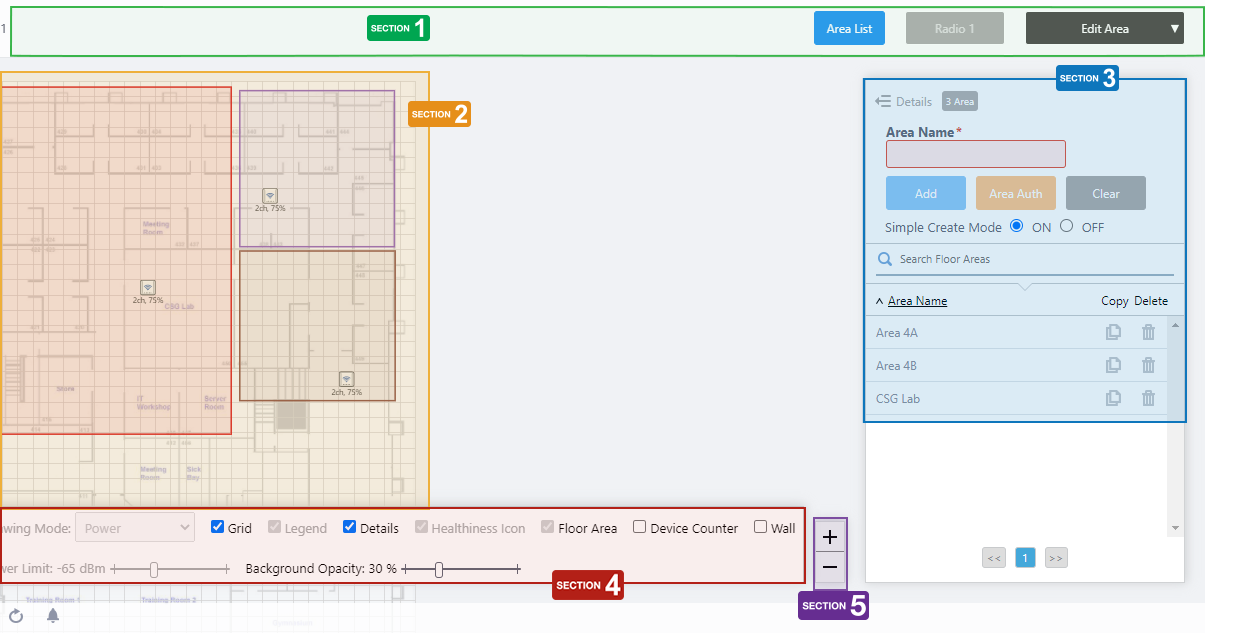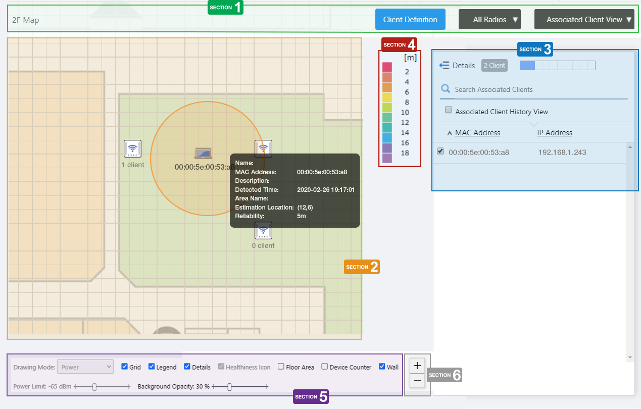 You can draw areas (rooms, etc.) with planar polygons, and name these areas such as "Meeting Room", "Lounge", and "Auditorium" on the floor map.The defined areas will be displayed in each View of the floor map, and also shown in the Location Estimation popup information in the Associated Client View.