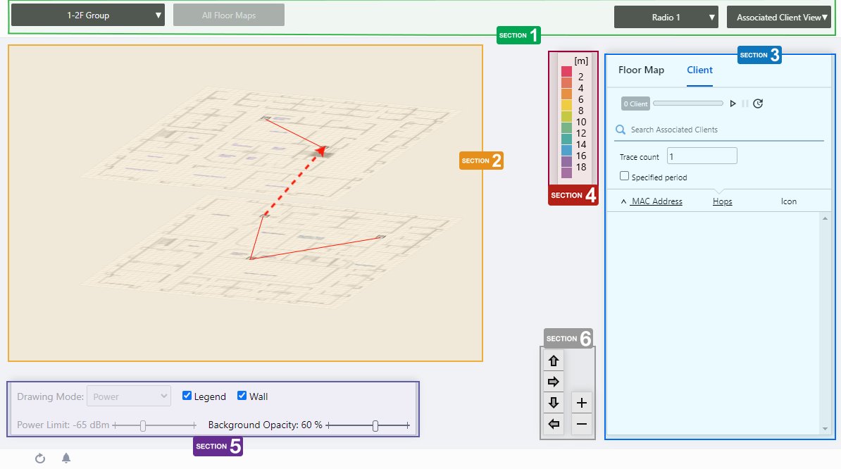 The layered floor map view allows you to grasp the status of APs, the number of associated clients and their locations and flow lines (when AWC-CB is used and the Client Location Estimation History function is enabled), and the connections of APs in the AWC-SC configuration across the floor maps in the same management group.