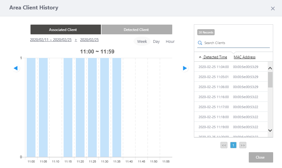 Displays "History Mode" screen to recall the status of APs and associated clients in the floor map details for a specified period. To use History Mode, the VST-APL on the same subnet must be registered as Vista Appliance Storage. For more information about the History Mode, please refer to Screen Reference > Wireless Monitor > Floor Map History Mode. |