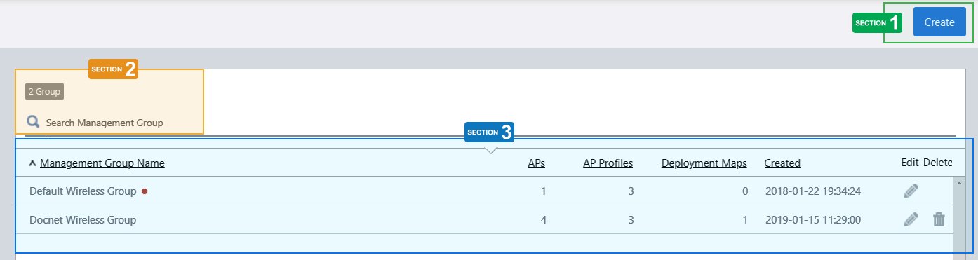 | "Create" button | Opens the "Create Management Group" dialog box. Refer to Operation Reference > Wireless Configuration > Configure Management Groups for more details. |