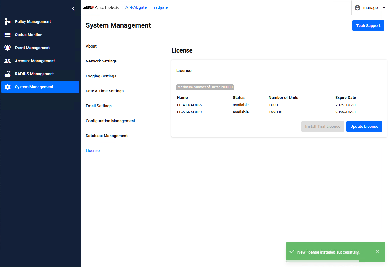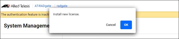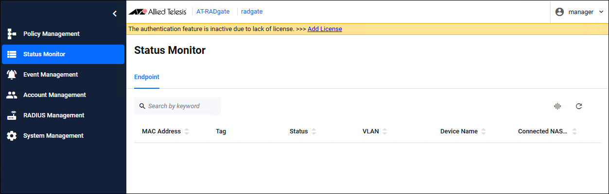 You have to install proper licenses before you start using AT-RADgate.- The RADIUS Authentication feature does not work until the license is installed.