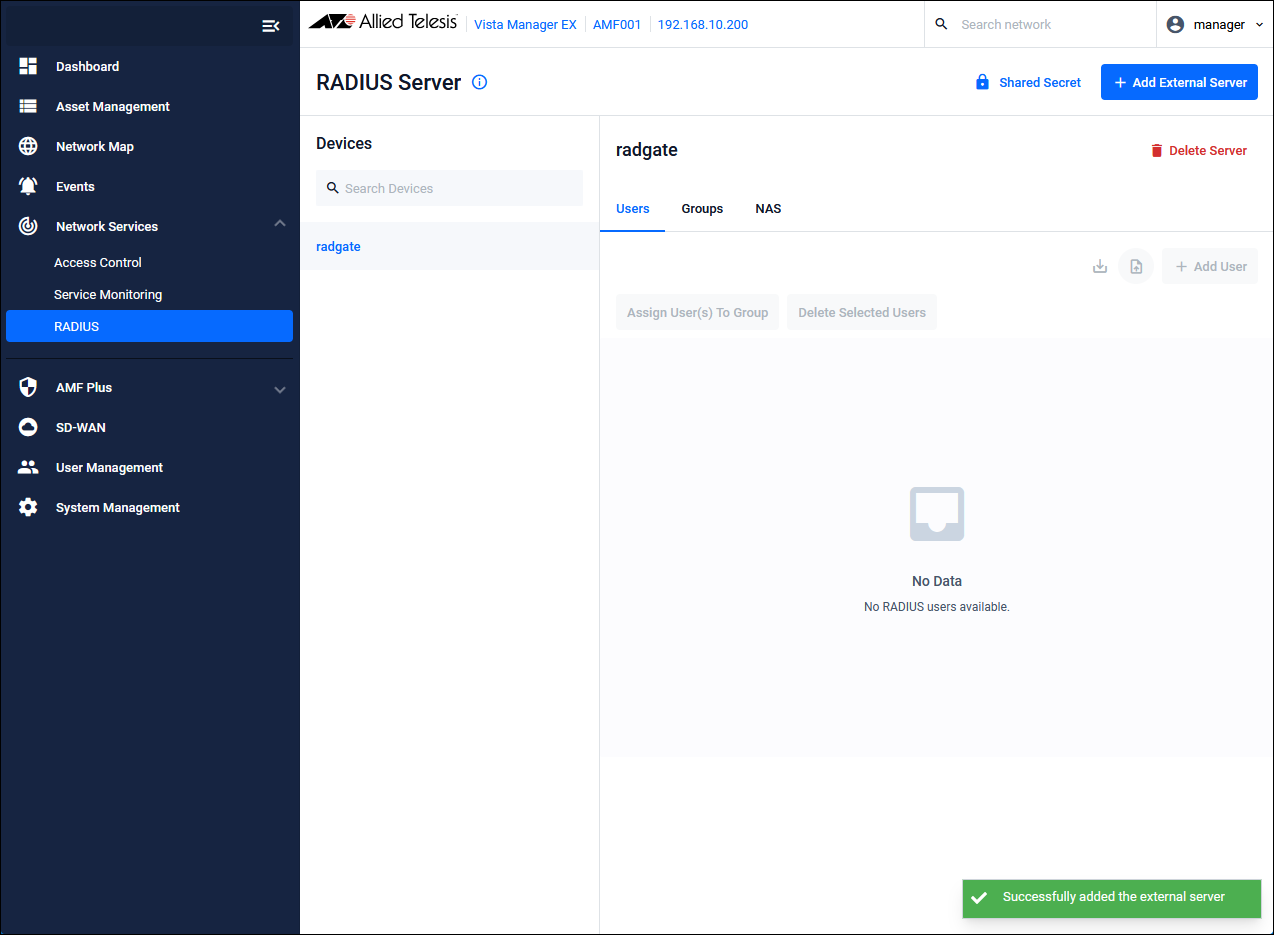 - Register AT-RADgate on the "Network Services / RADIUS" page of Vista Manager EX