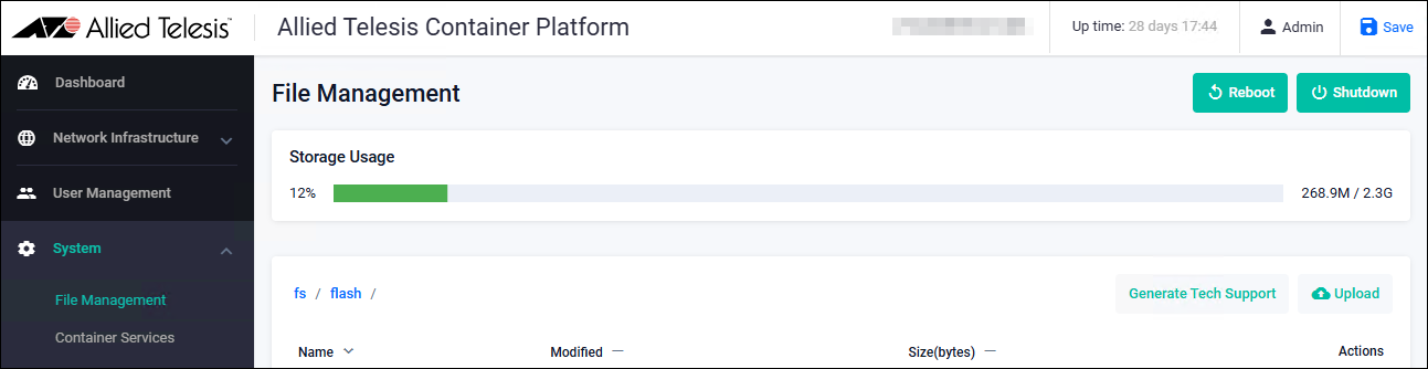 Log in to the configuration page of the Allied Telesis Container Platform.On the System > File Management page, click the "Shutdown" button.