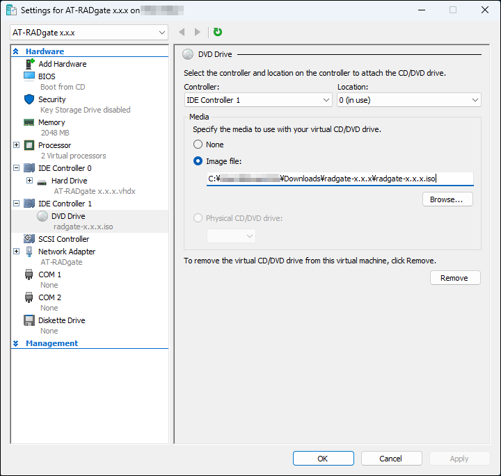 Click the "Browse" button in the Image File field, specify the ISO image file for installing AT-RADgate, and click the "OK" button.