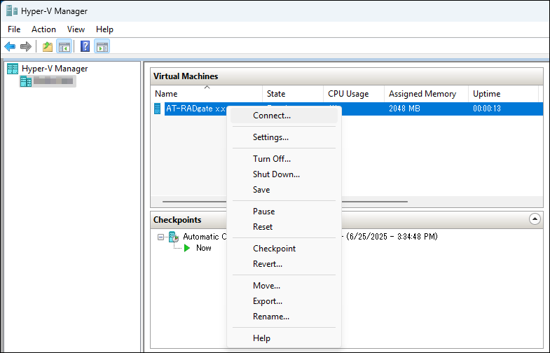 - Right-click the virtual machine for this product again in the Virtual Machine pane, and select "Connect" from the context menu.