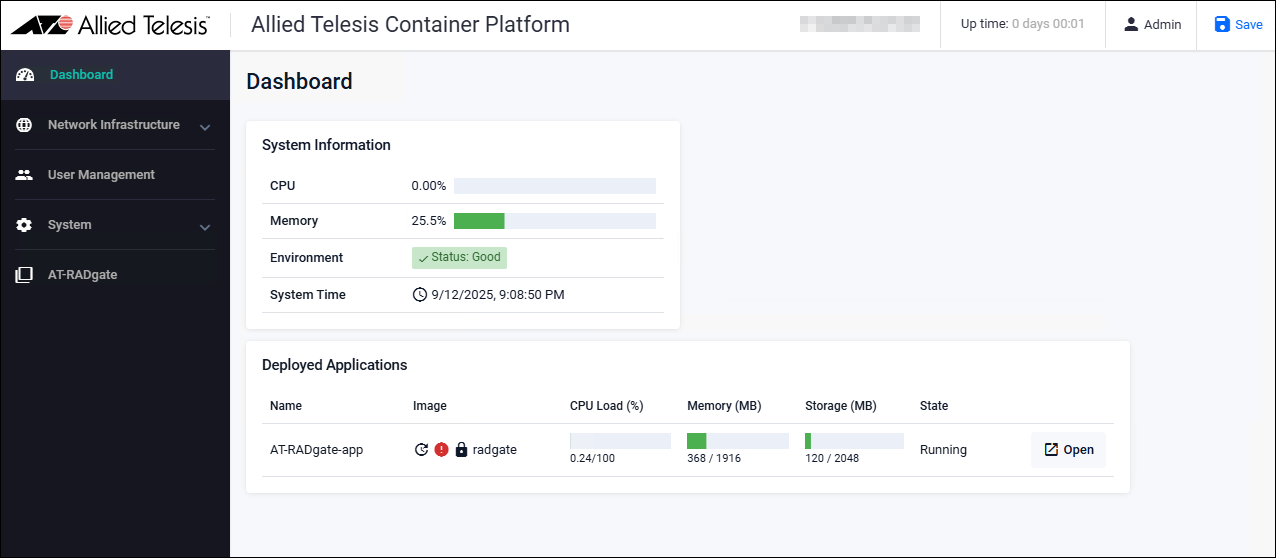 - Log in to the configuration page of the Allied Telesis Container Platform. The Dashboard page displays the following message.
