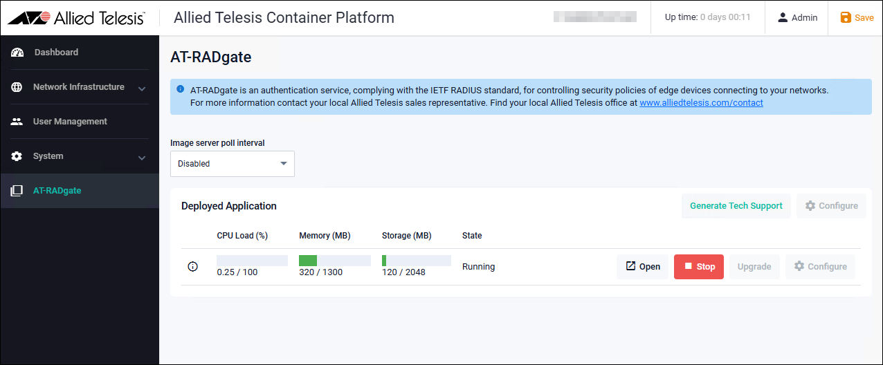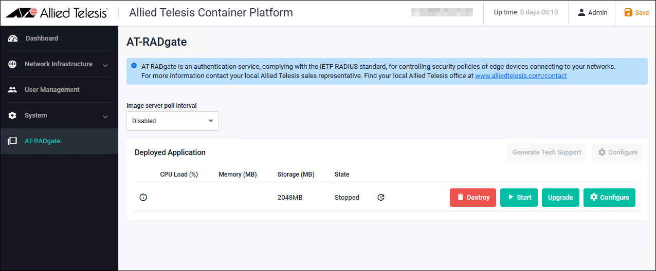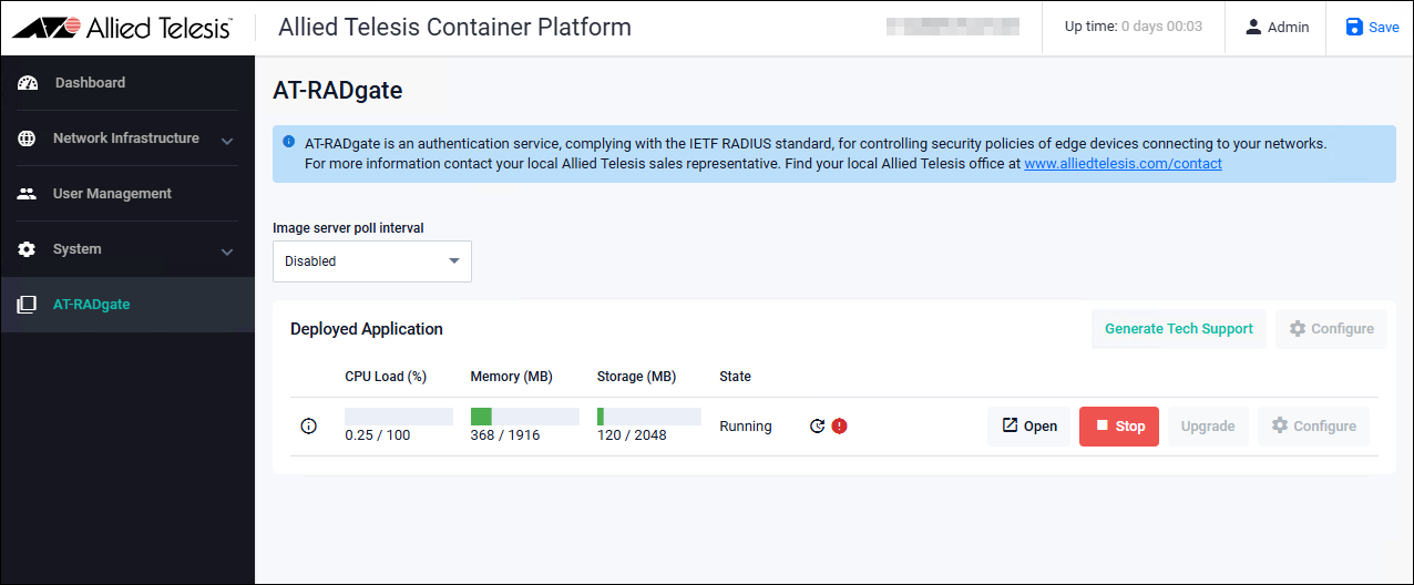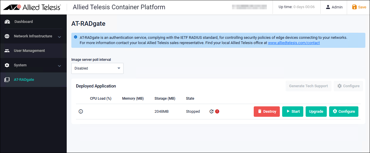 Download the AT-RADgate package version 1.1.1 file (radgate-1.1.1.iso) from our website.The following table shows the versions of the Allied Telesis Container Platform and the AT-RADgate application included in AT-RADgate package version 1.1.1.