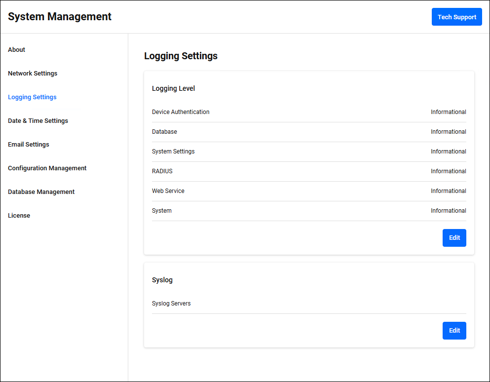 System Management > Logging Settings > Logging LevelYou can change the output suppression level for each event log. Each event log logs events with a greater importance, including the level set here. For information about log levels, refer to "Logging Level" in Event Management > Application Log. Click the "Edit" button at the bottom right to enter edit mode.