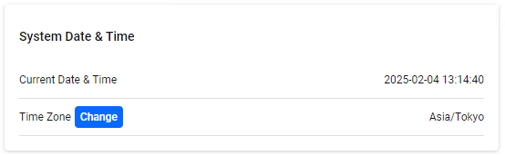 | Time Zone | Displays the current Time Zone in the format "Region/Time Zone". Clicking the "Change" button displays the Time Zone dialog, allowing you to change the Time Zone. |