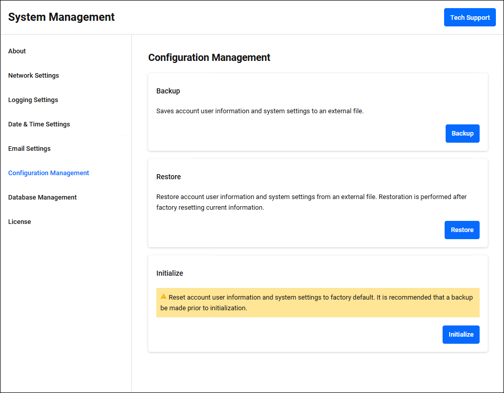 System Management > Configuration Management > InitializeResets the administrator account information and system settings to the factory defaults.
