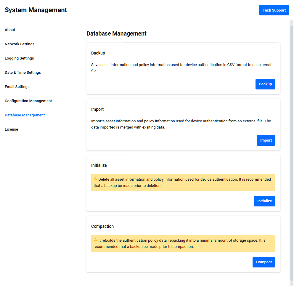System Management > Database Management > ImportImports authentication policy data from a CSV file. The imported data is merged with the current data.