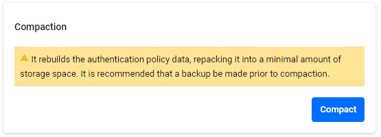 System Management > Database Management > CompactionOptimize authentication policy data and free up storage space. Allied Telesis recommends that you make a backup before optimizing.