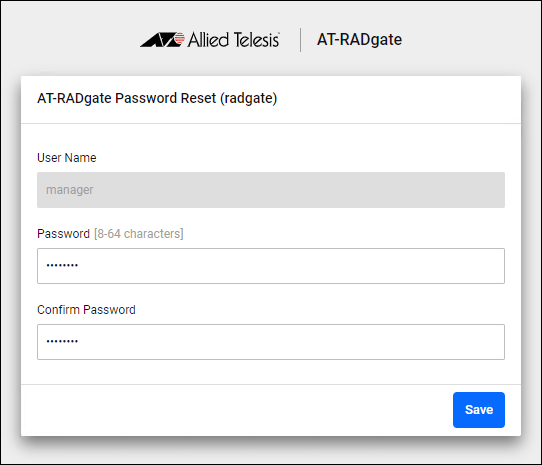 - The "AT-RADgate Password Reset" page appears, so enter your new password, confirm the password, and click the "Save" button.