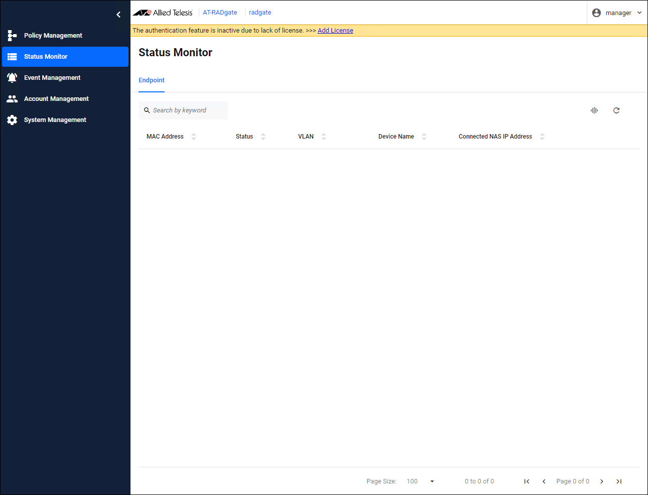 - Once you have successfully logged in to AT-RADgate, the "Endpoint" tab on the Status Monitor page is displayed.