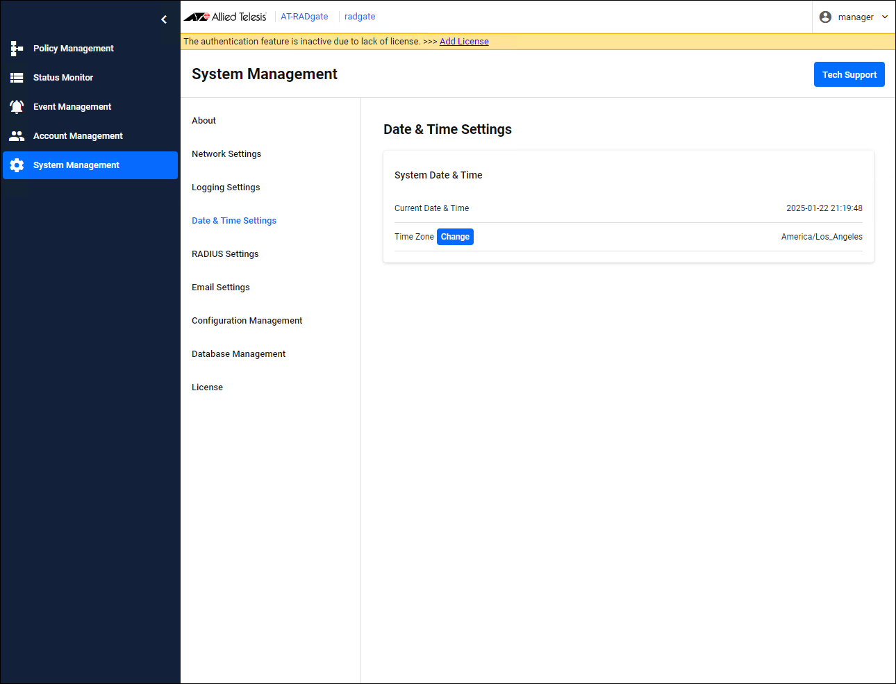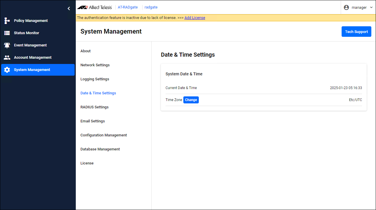 - Click the "System Management" menu, then the "Date & Time Settings" submenu, and click the "Change" button on the Date & Time Settings page that appears.
