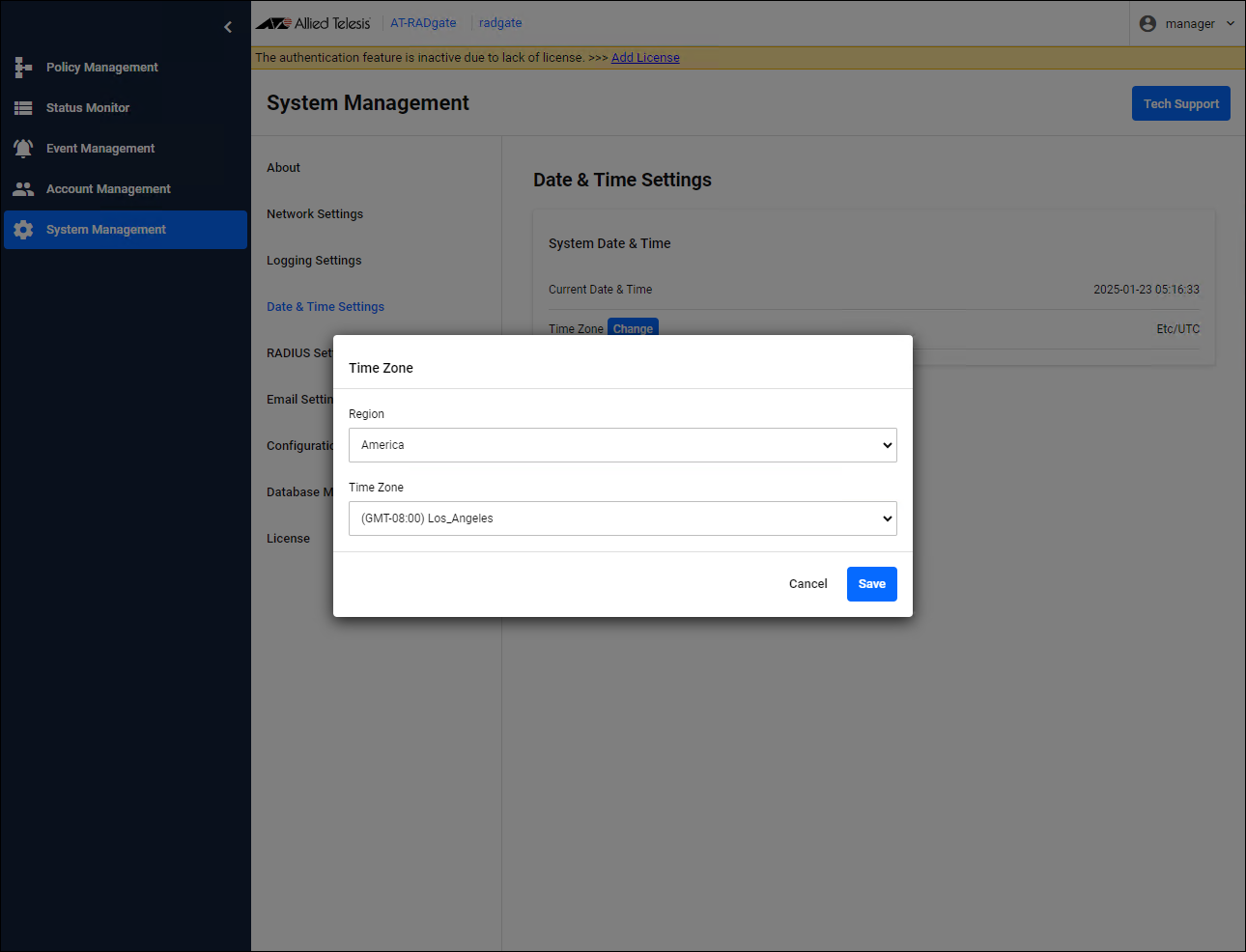 - The Time Zone dialog appears, so select from the region dropdown list and Time Zone dropdown list, then click the "Save" button.