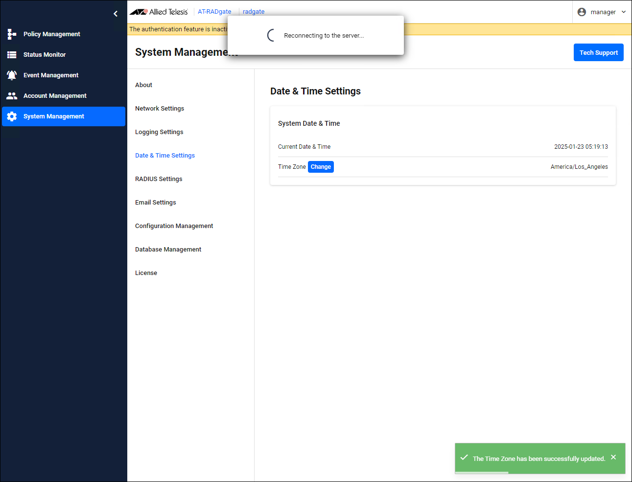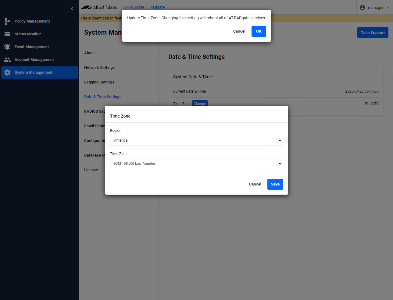 AT-RADgate gets and uses the system time of VST-APL/VST-VRT, but it does not get the Time Zone setting. Therefore, for example, to use Japan time (JST: 9 hours ahead of Coordinated Universal Time (UTC)), set according to the following procedure:NoteIf you change the Time Zone setting, AT-RADgate restarts.