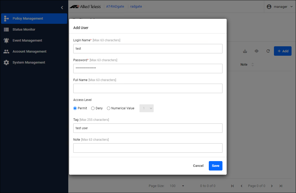 Click the "Add" button in the upper right corner of the Policy Management > User page to display the Add User dialog.
