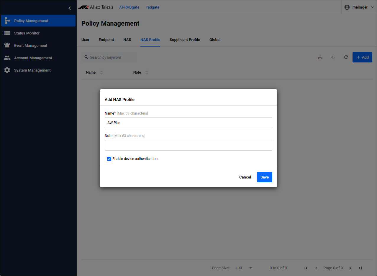 The RADIUS Server authenticates the sender (NAS) of the received message. During this process, messages sent by unauthorized sources are discarded.Therefore, to correctly build an authentication system, all systems that send RADIUS Authentication requests must be registered in AT-RADgate. Register the NAS and NAS Profile on the Policy Management > NAS page.