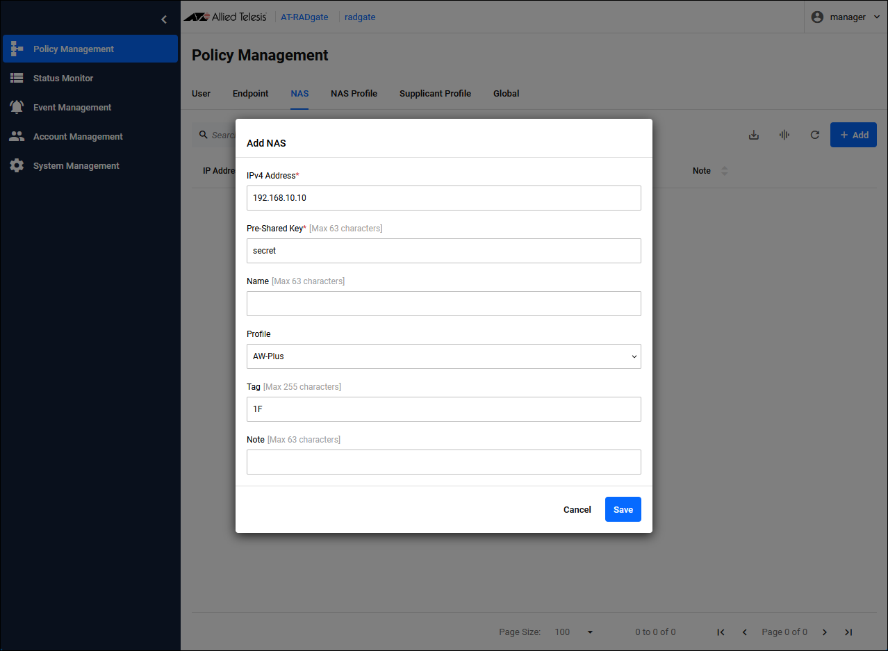 Therefore, to correctly build an authentication system, all systems that send RADIUS Authentication requests must be registered in AT-RADgate. Register the NAS Profile and NAS on the Policy Management > NAS page.