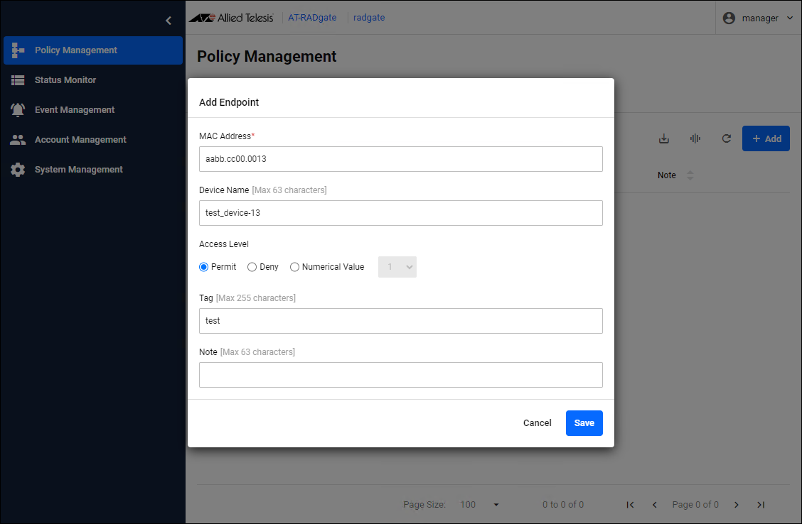 If endpoint authentication is enabled, AT-RADgate evaluates whether the MAC Address stored in the authentication request message matches the one registered in the RADIUS Server.Register the Endpoint policy on the Policy management > Endpoint page. You can also import using a CSV file.