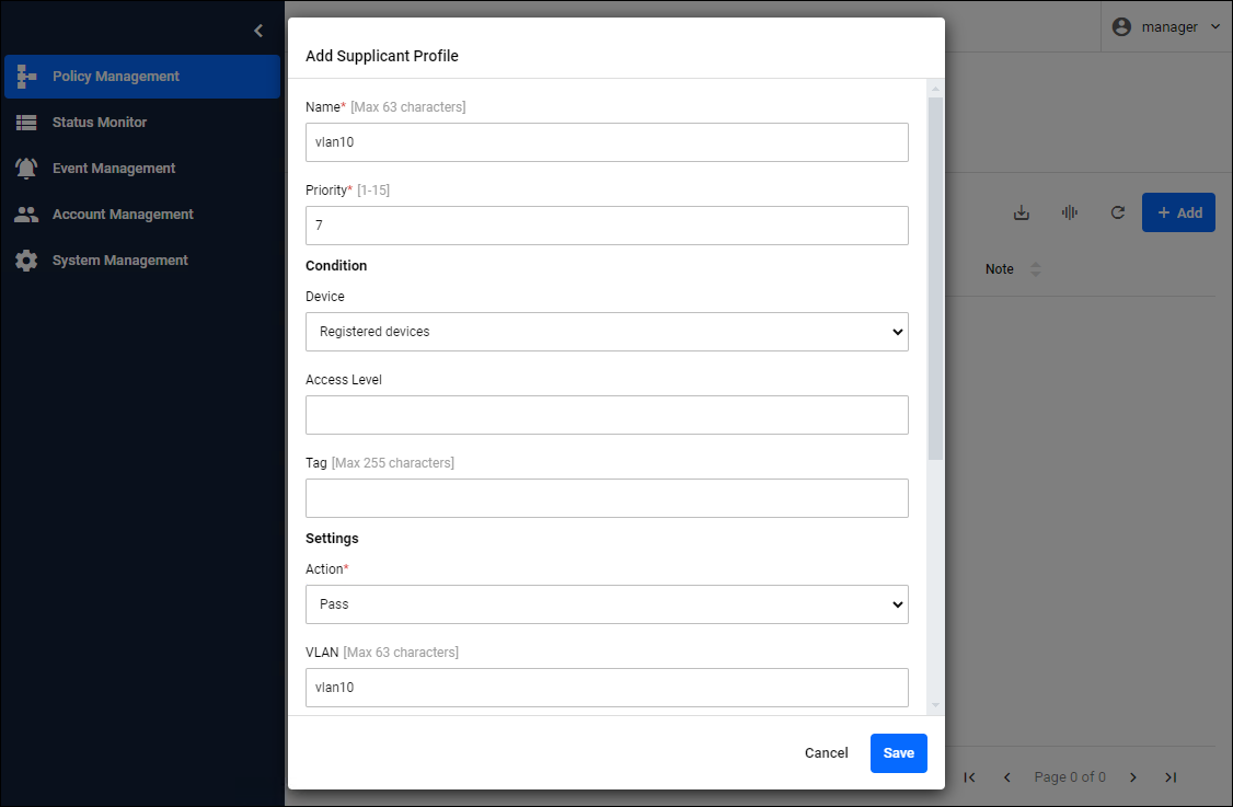 The name is the identifier for the Supplicant Profile. Set a name that does not overlap with any already registered profiles. The priority is the order in which profiles are applied to authenticated devices; profiles with the lowest value are evaluated first, and the first matching profile is applied.