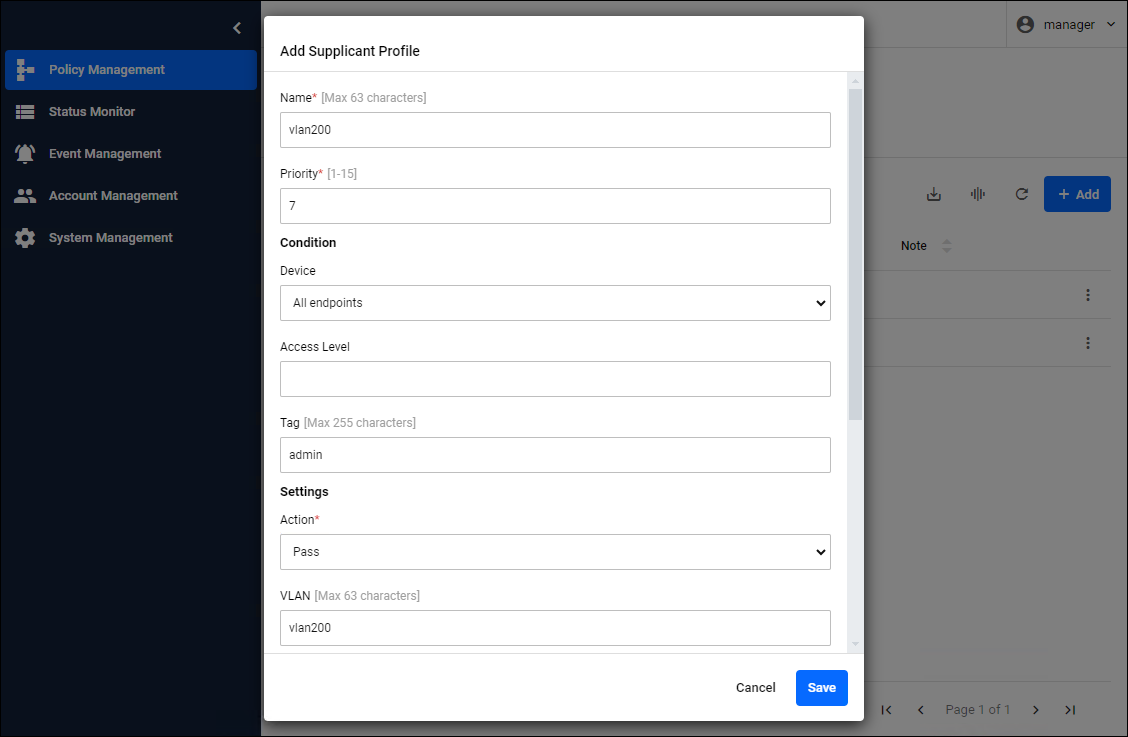 If you want to connect certain groups to different networks, you can use access levels or tags. If you want to connect only devices with the tag "admin" to "vlan200", set the following in the Add Supplicant Profile dialog.