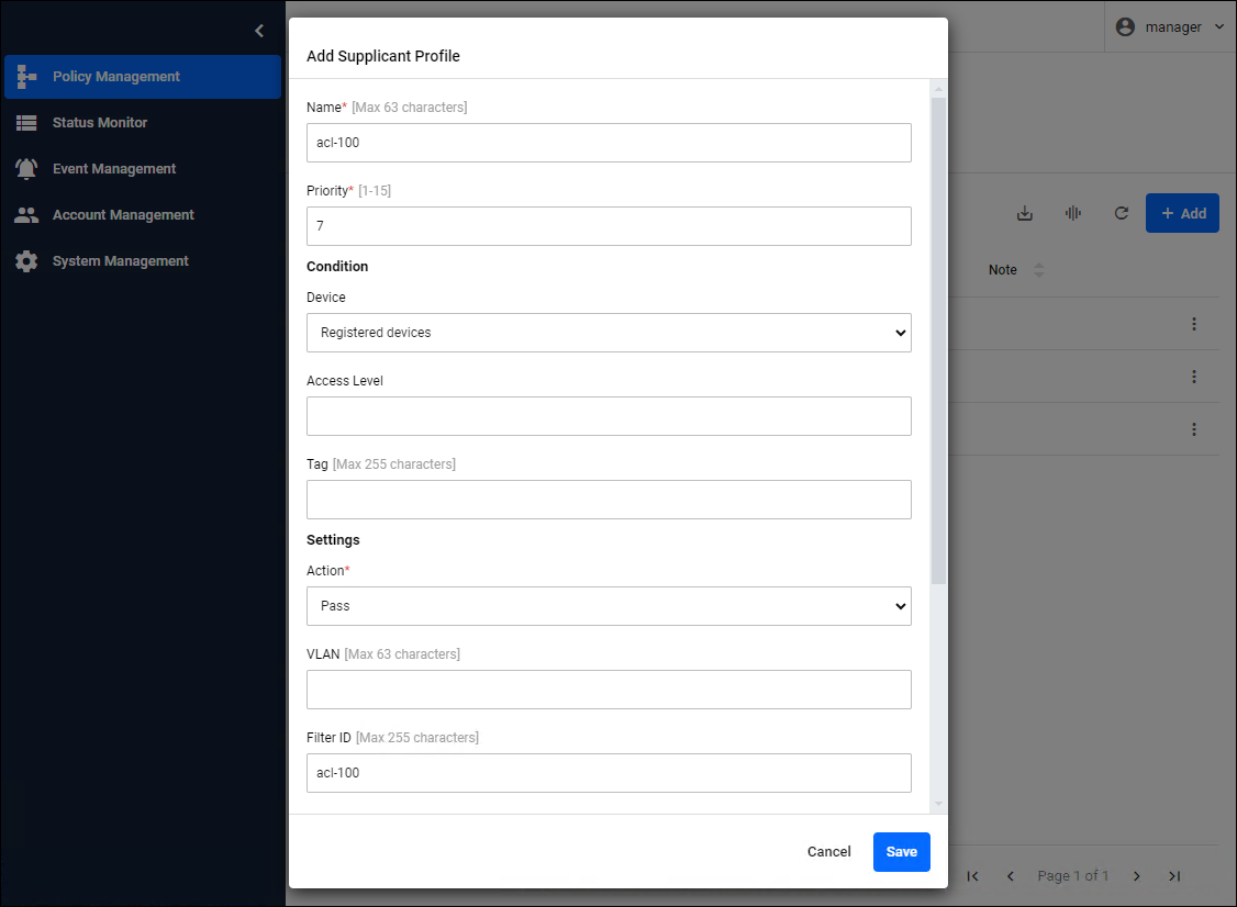 When using AW+ Switch in conjunction with endpoint authentication, you can set an ACL (packet filter) for authenticated endpoints by registering Supplicant Profile.Register Supplicant Profile on the Policy Management > Supplicant Profile page. You can also import using a CSV file.