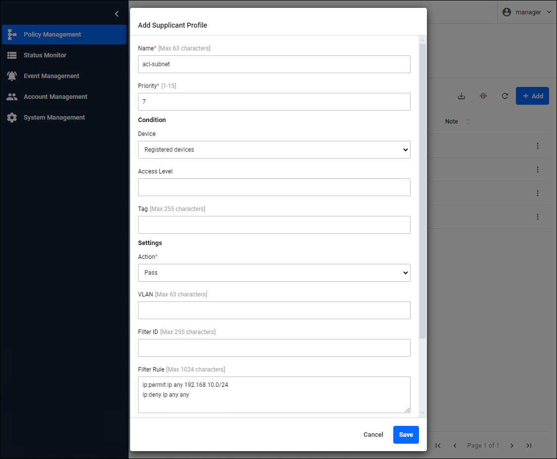 To apply an ACL that only allows communication with the 192.168.10.0/24 subnet to all registered devices, set the following in the Add Supplicant Profile dialog.
