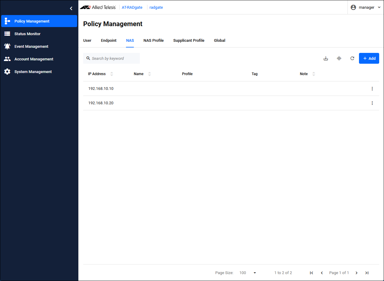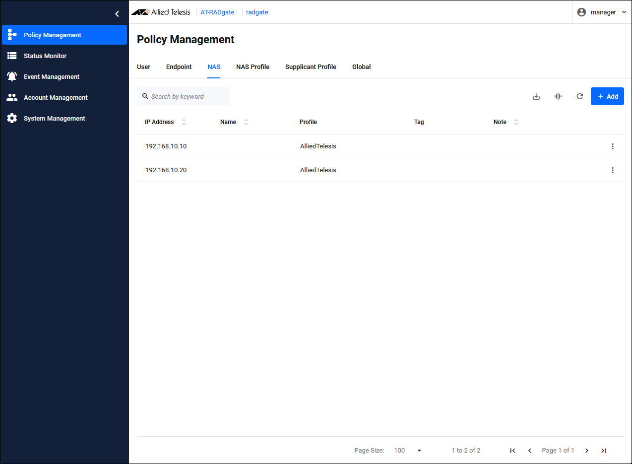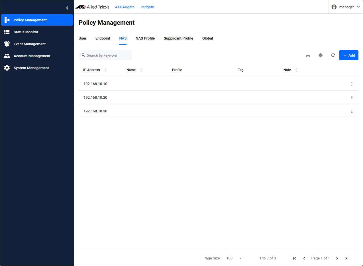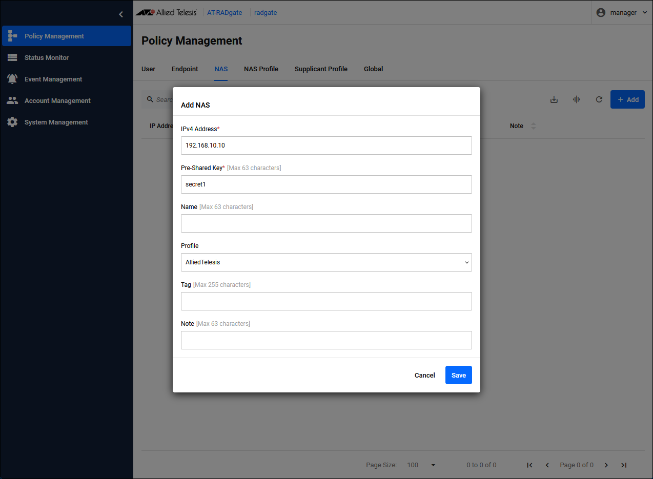 - Register the NAS policy on the AT-RADgate Policy Management page