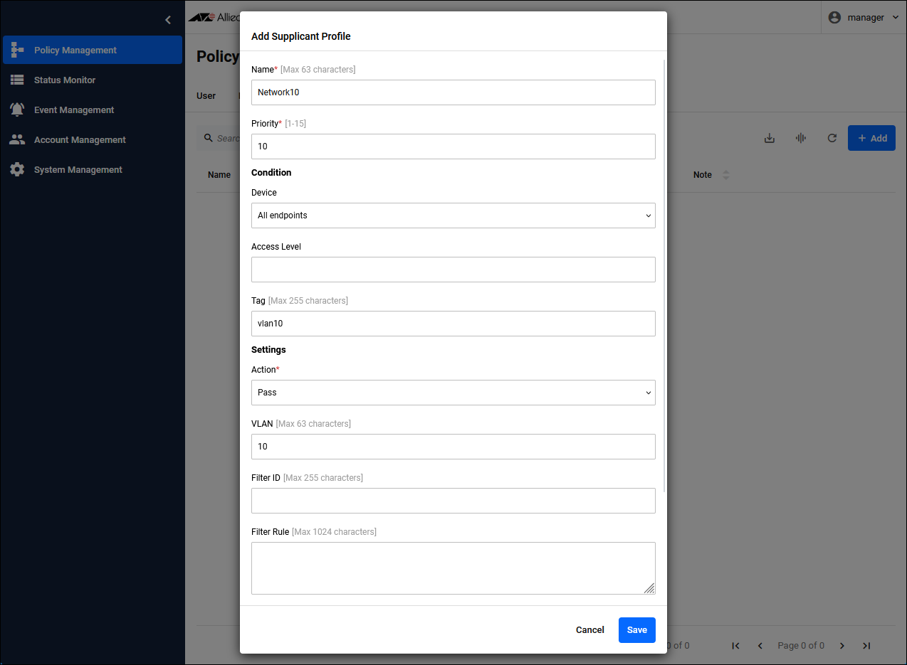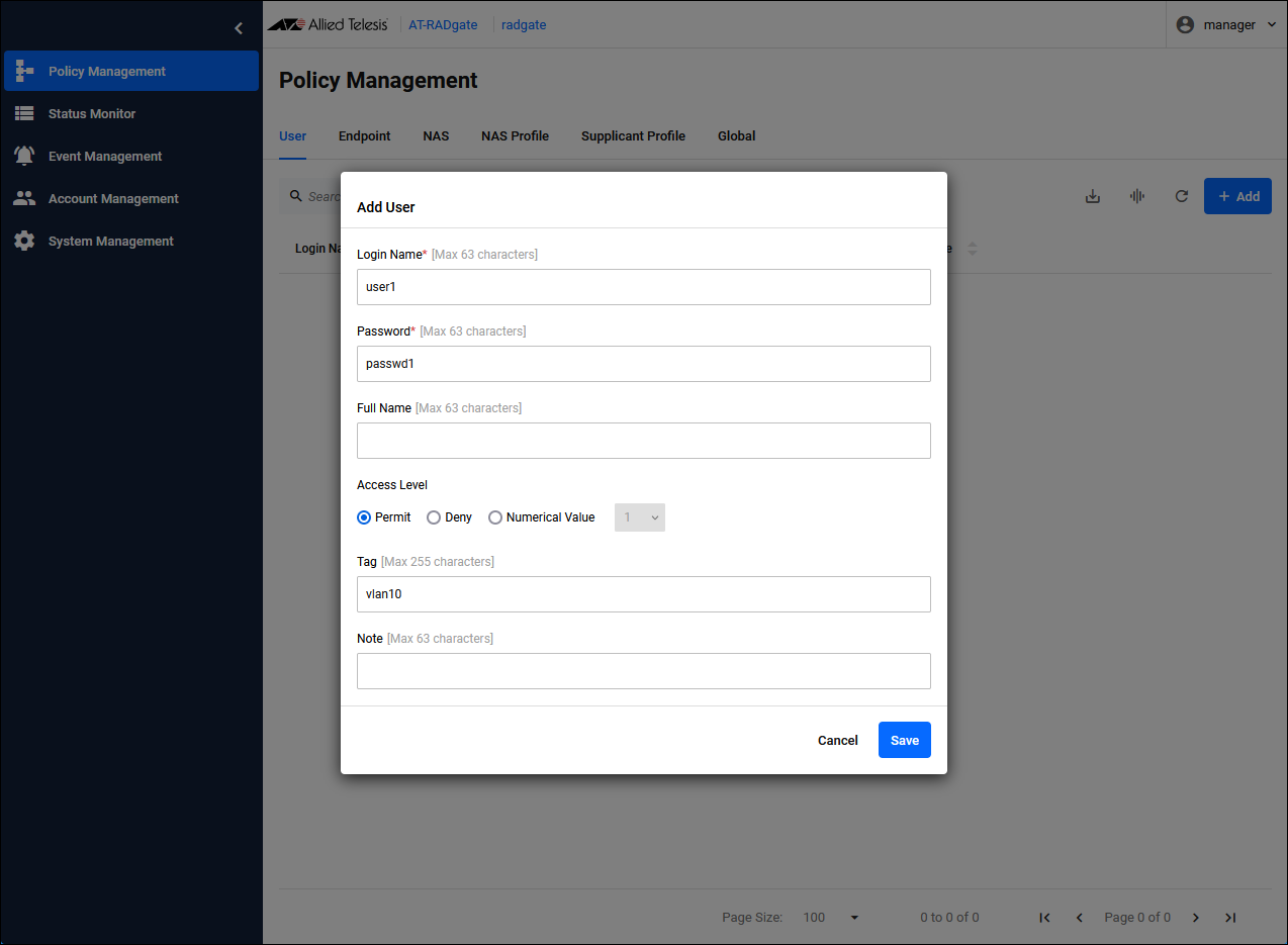 Configure the information for each supplicant. You specify the network (VLAN) to which each supplicant is connected, but the actual network specification is done in the "Supplicant Profile." Here, we use "Tag" to link "User" and "Supplicant Profile".Click the "Add" button in the upper right corner of the Policy Management > User page to display the Add User dialog.