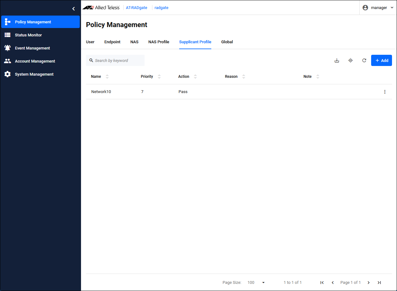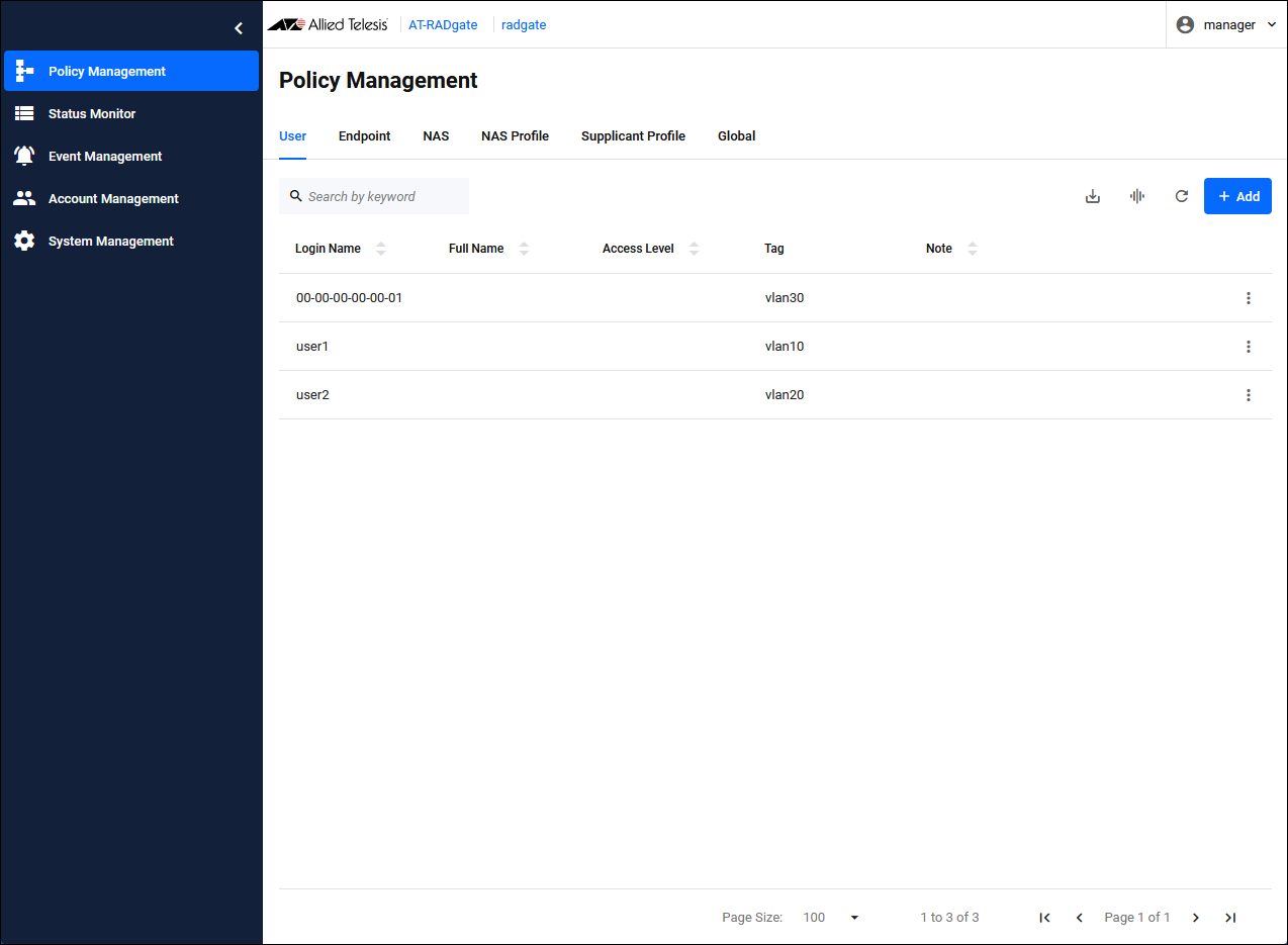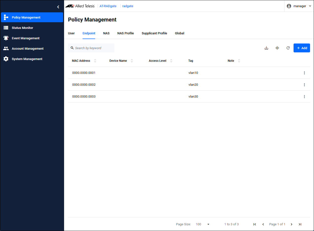 NoteDo not register "Endpoint" and "Supplicant Profile" on the AT-RADgate Policy Management page. These are added via operations on the "Endpoint" tab on the "Asset Management" page of Vista Manager EX, or via "Users" and "Groups" on the "Network Services / RADIUS" page, and are registered in AT-RADgate.For information on operating Intelligent Edge Security, refer to the Vista Manager EX document posted on our website.