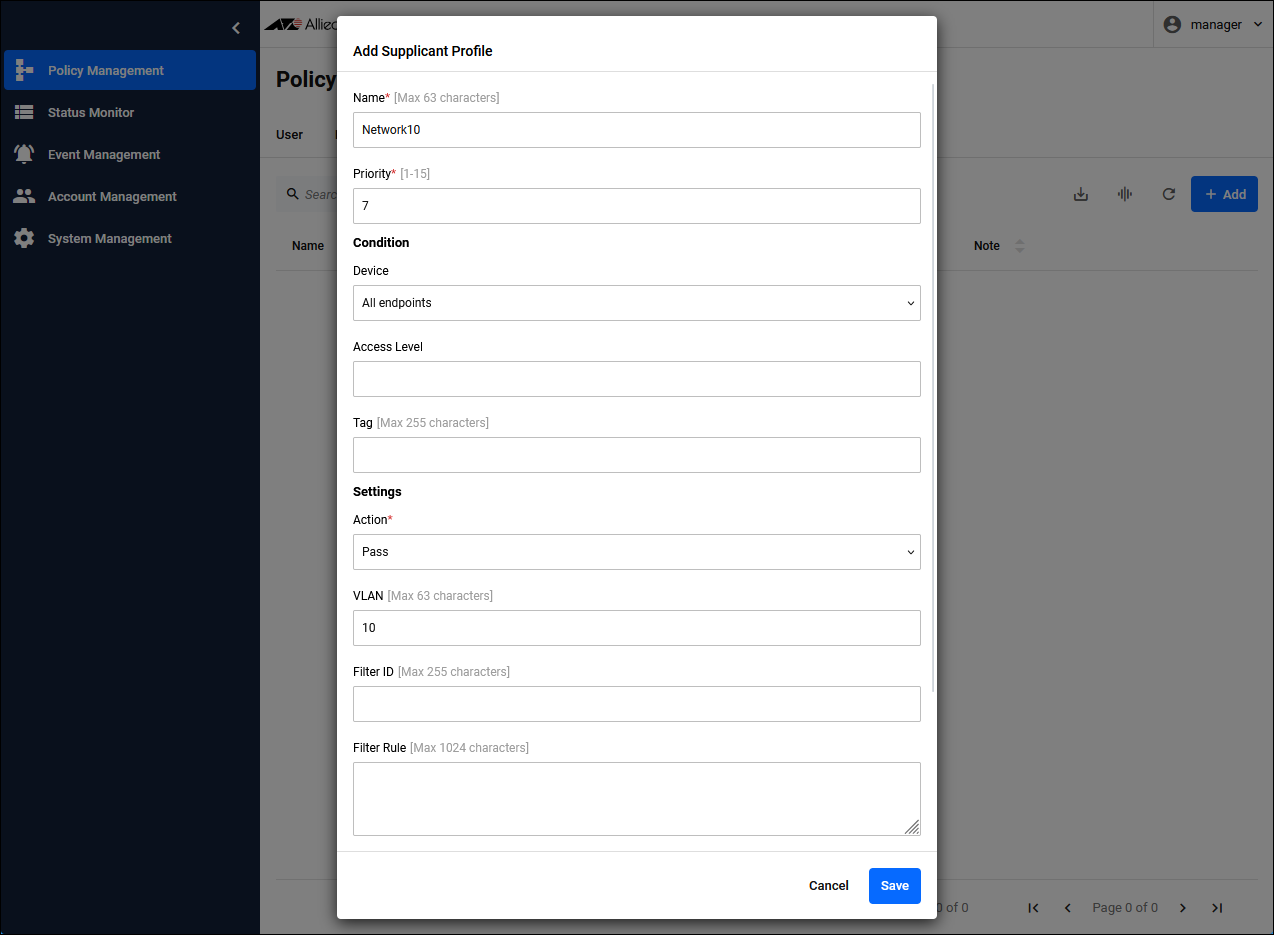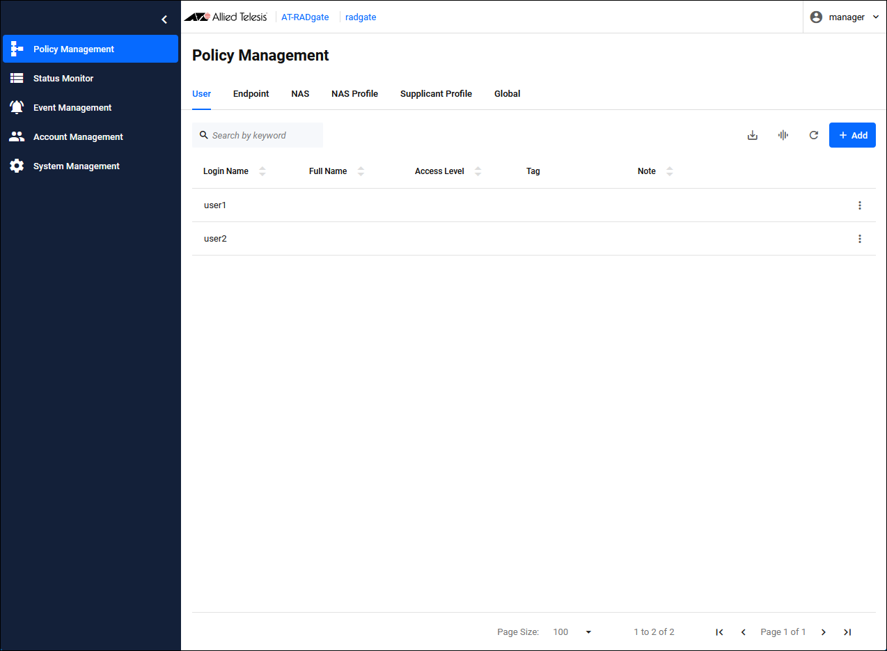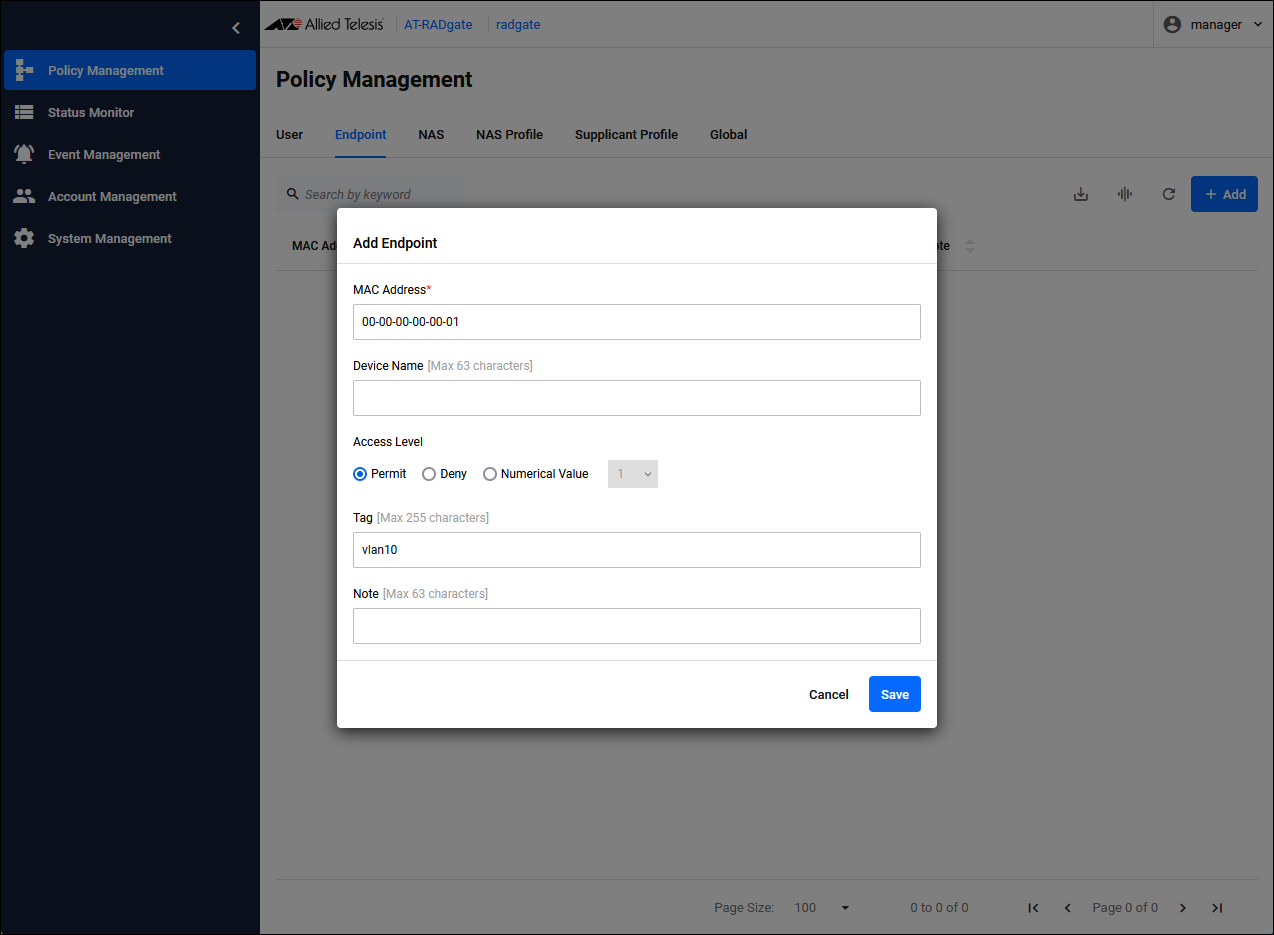 NoteDo not register "Endpoint" and "Supplicant Profile" on the AT-RADgate Policy Management page. These are added via operations on the "Endpoint" tab on the "Asset Management" page of Vista Manager EX, or via "Users" and "Groups" on the "Network Services / RADIUS" page, and are registered in AT-RADgate.For information on operating Intelligent Edge Security, refer to the Vista Manager EX document posted on our website.
