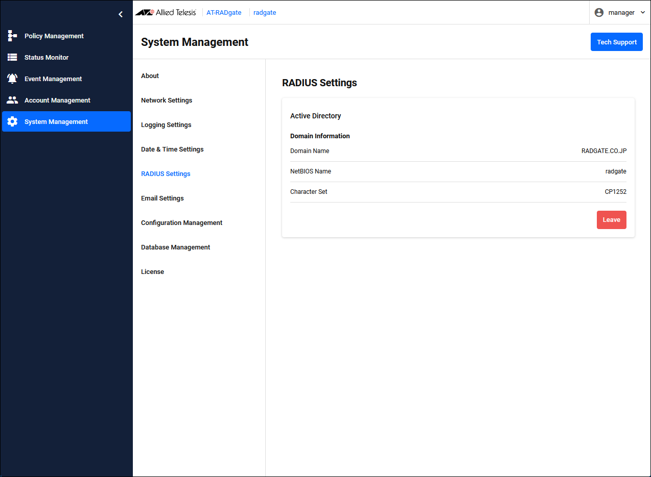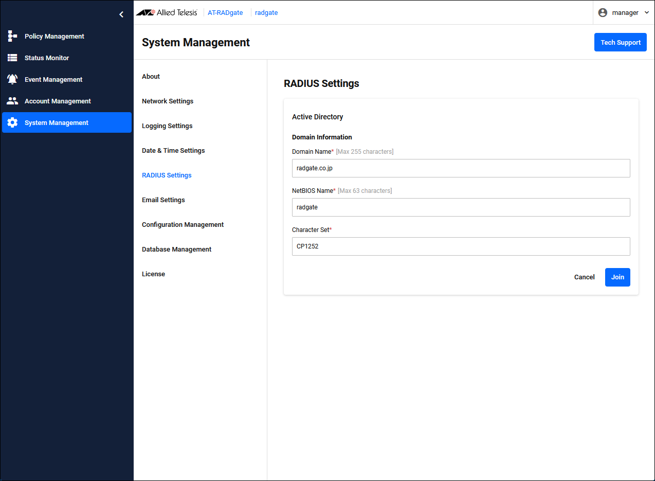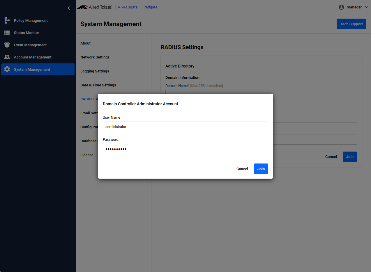 - Register Windows Active Directory settings on the AT-RADgate System Management > RADIUS Settings page
