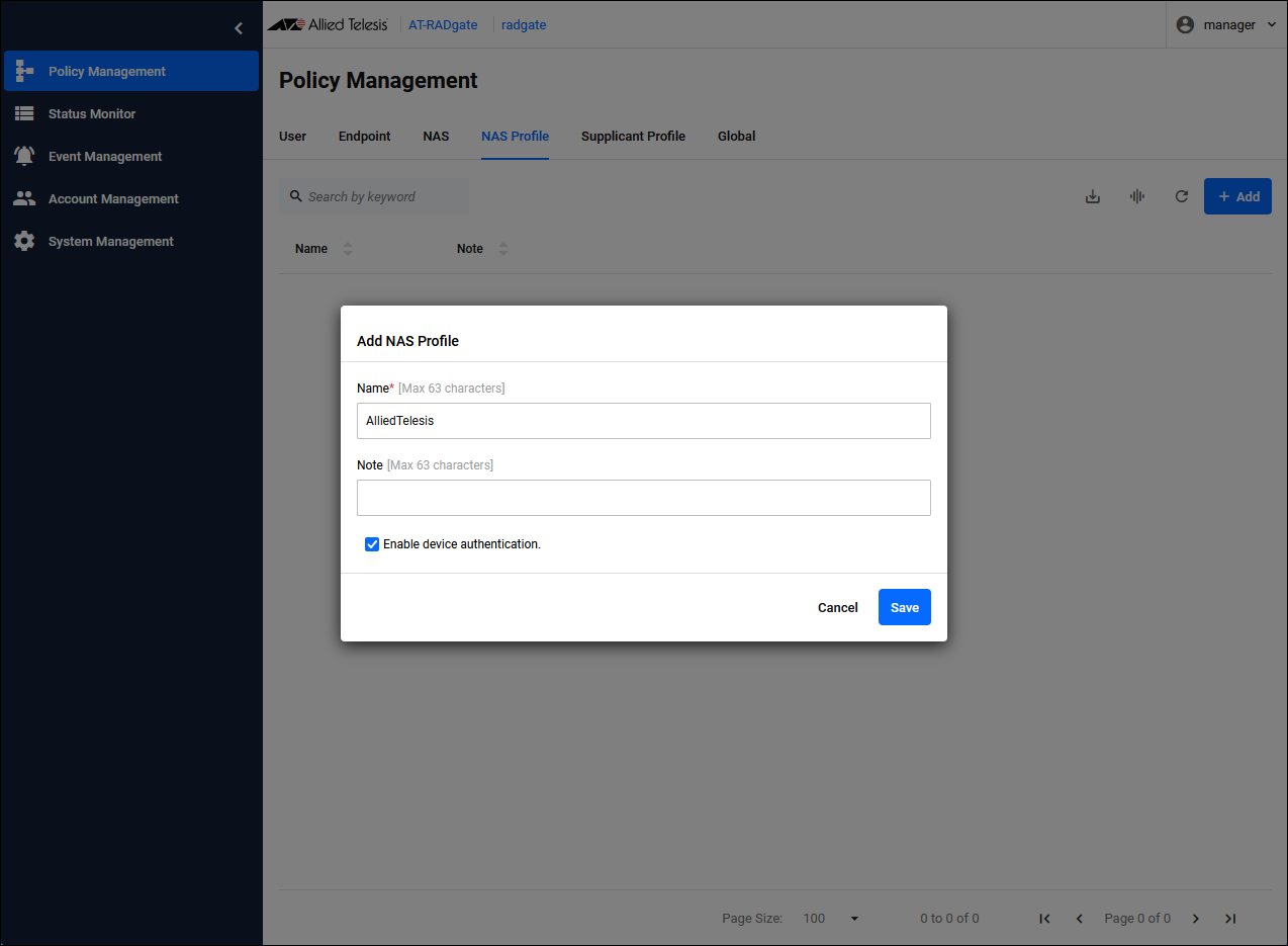 - Register the NAS Profile policy on the AT-RADgate Policy Management page