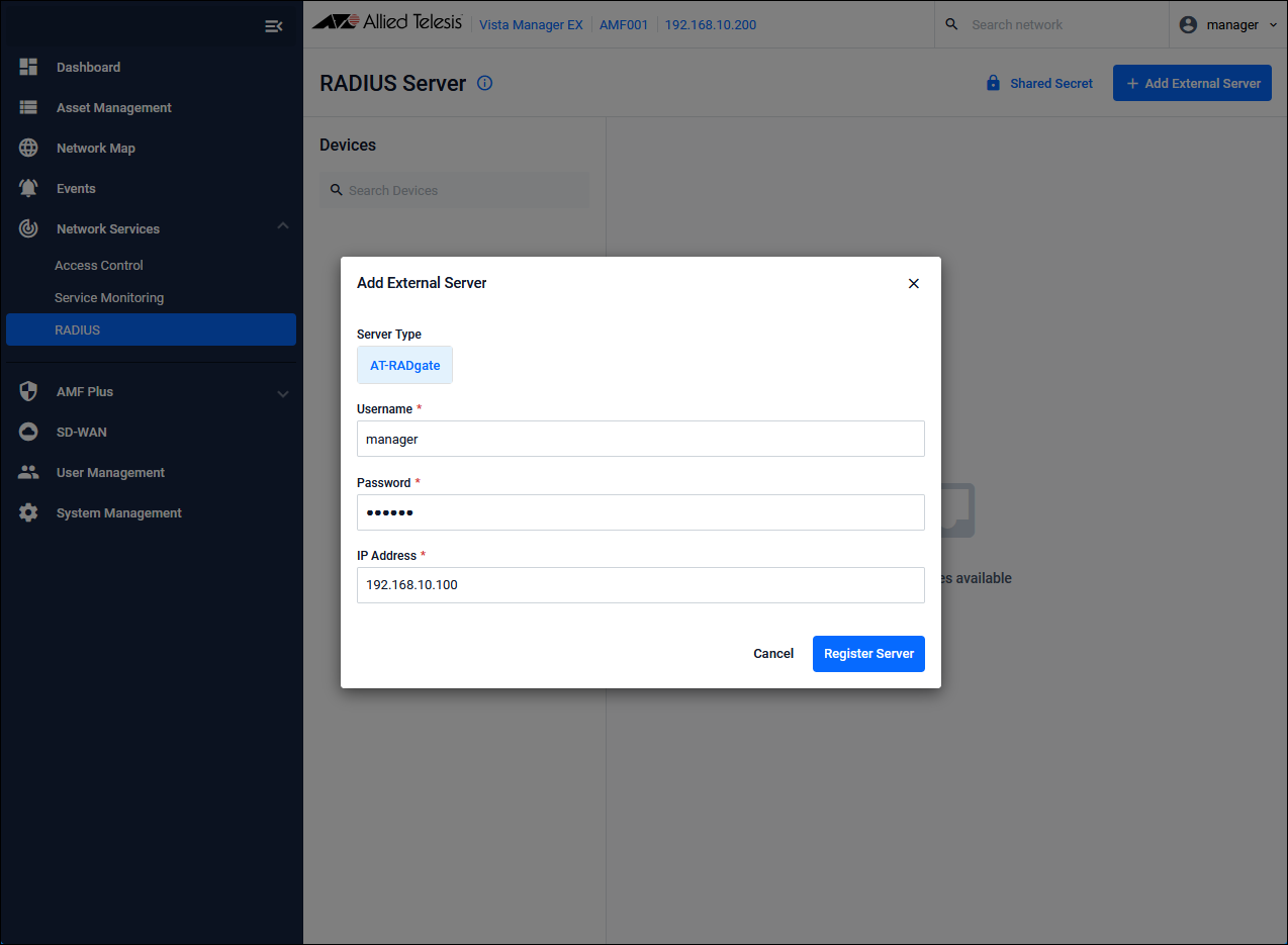 - Register AT-RADgate on the "Network Services / RADIUS" page of Vista Manager EX