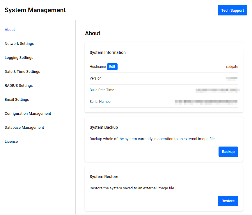 On the "About" page, you can view system information, change the Hostname, and backup and restore your system.