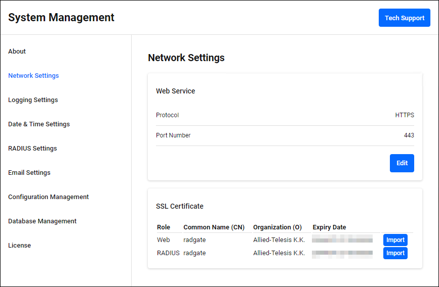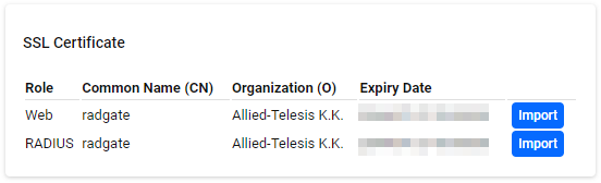 You can check and change the certificates used by each AT-RADgate service. Click the "Import" button on the right side of each service row to display a dialog box for uploading the certificate file.If you have changed it from the default certificate, the "Delete" button appears. Clicking this button deletes the current certificate and starts using the default certificate.
