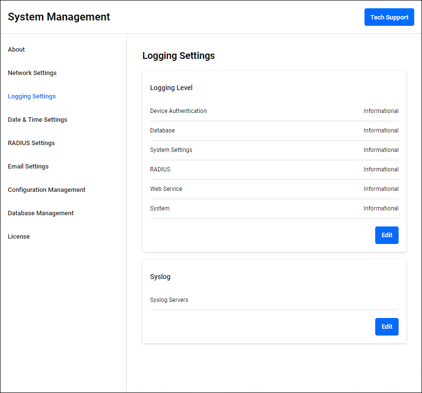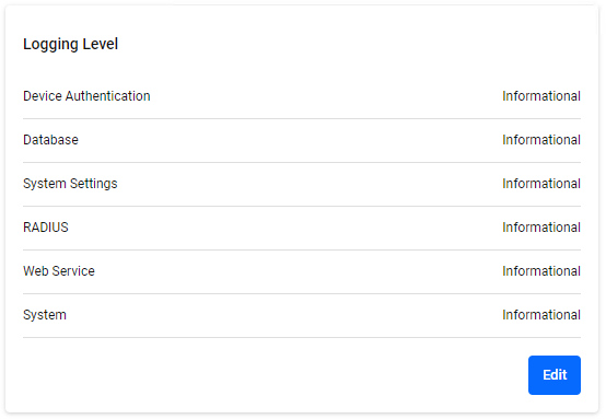 You can change the output suppression level for each event log. Each event log logs events with a greater importance, including the level set here. For information about log levels, refer to "Logging Level" in Event Management > Application Log. Click the "Edit" button at the bottom right to enter edit mode.